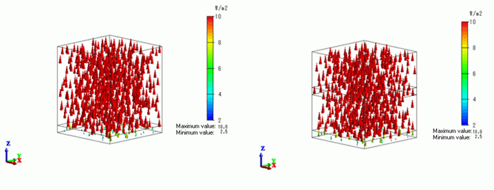 The vector diagrams of the heat flux of the Models 1 and 2 are shown below. The unit of the color scale is [W/m2].