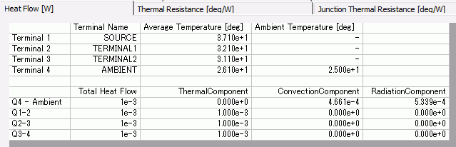 At Q1-2, the heat flow rate from the heat source body SOURCE (Terminal 1) to the measuring terminal TERMINAL1 (Terminal 2) is 0.001 [W].