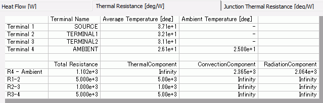 At R3-4, the thermal resistance is 5000[deg/W] between the measuring terminal TERMINAL2 (Terminal 3) and the boundary AMBIENT (Terminal 4).