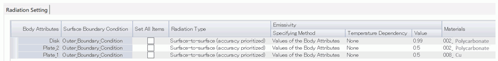 [Follow the outer boundary condition] is set to each of them and [Surface-to-surface (accuracy prioritized)] is set as an outer boundary condition. It is confirmed that all surfaces are treated as those for the surface-to-surface radiation.
