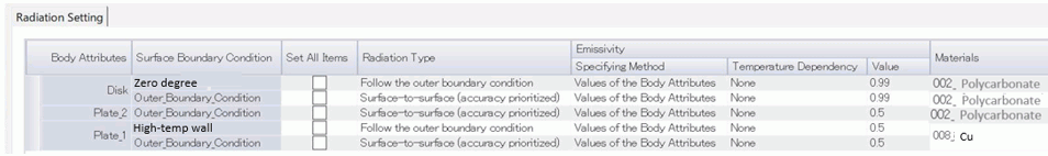 The radiation setting can be done at [Thermal Analysis tab] > [Radiation Setting] dialog box as well.
