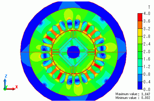 The distribution of the magnetic flux density at the rotation angle of 0[deg] is shown below.