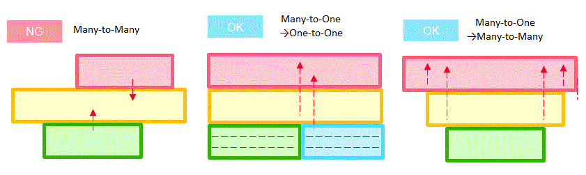 The left figure illustrates many- to-many relationship on the yellow body and then sweep mesh is not applicable. The center and right figures illustrate many-to-one relationship and then sweep mesh is applicable.