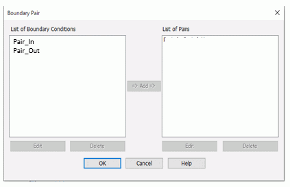 Selects the boundary conditions to pair up in the list. By pressing the Add button, the Edit Boundary Pair dialog will show up. The OK button completes the pairing. |