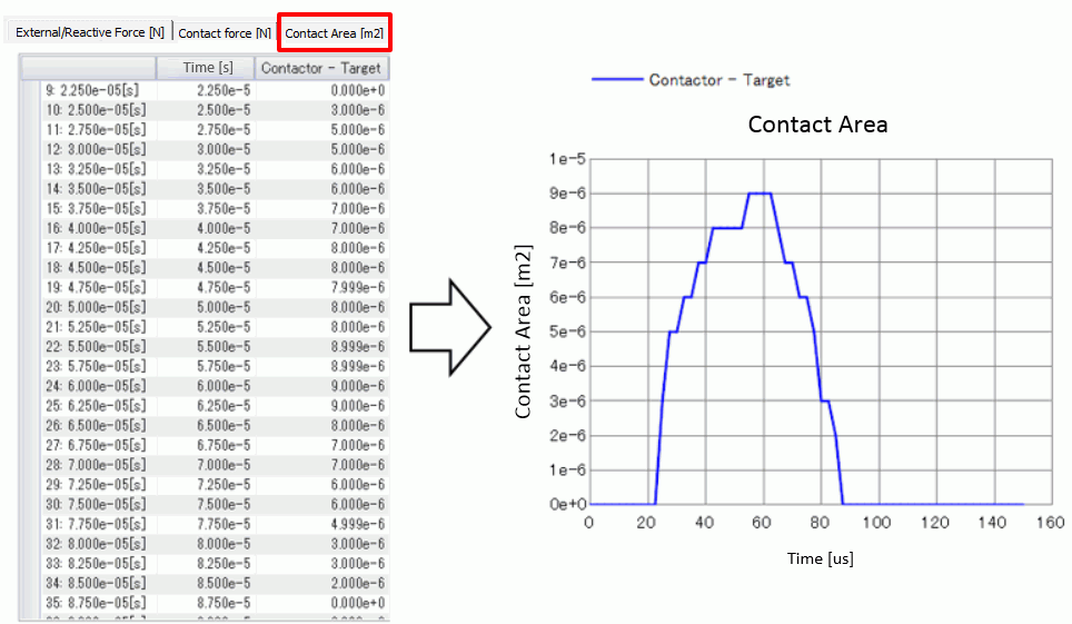 The contact area becomes largest at around 60 us.
