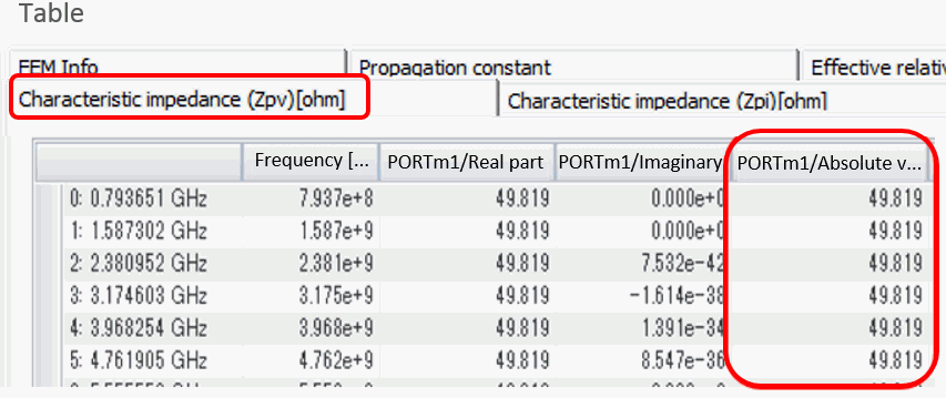 Fig. 4: Results Table for Discontinuous Part (Characteristic Impedance [Zpv])
