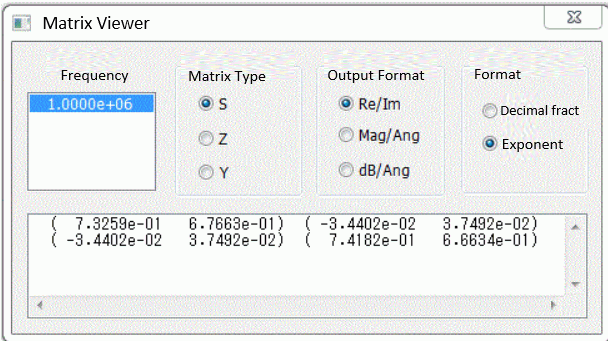 In the [Matrix Viewer] dialog box shown above, Re/Im is selected at Output Format.