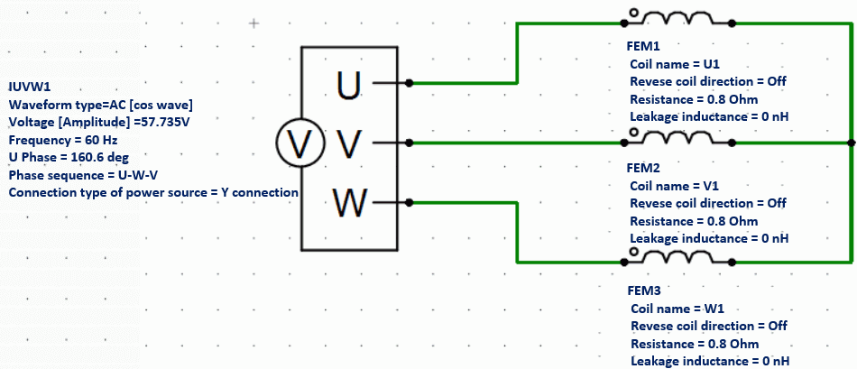 By setting the voltage to 0 for the power of the external circuit, and deselecting the fast stabilizer, the cogging torque and the induced voltage with no load can be calculated.