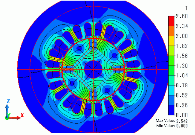The distribution of the magnetic flux density and magnetic flux lines at the rotation angle of 0 [deg] are shown below.