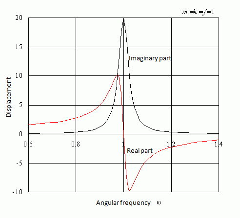 The right figure shows the real and the imaginary parts of the equation above each. The real part is zero at the resonant frequency. Thus, the peak of displacement is divided.