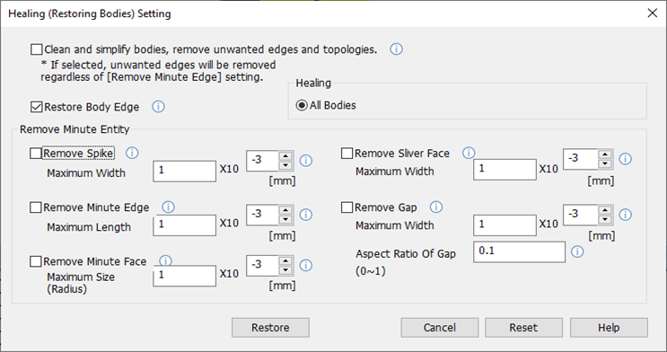 [All Bodies] ・All sheet/solid bodies that exist on the modeling window are subject to healing.