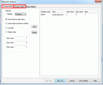 Set up the sweep conditions for the variables Set how each variable to be swept. Enter the sweep conditions on the [Sweep Setting] tab. Multiple conditions can be set up. Confirm the conditions on the [Sweep Table] tab. See [Sweep Setting] and [Sweep Table] for more information.