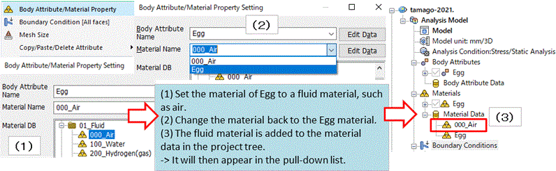 Note: How to cope when the pull-down list of fluids is not displayed. ・ Not in the results window, but in the modeling window, set a correction factor for convection. (Refer here for the difference between windows.) ・ Once the fluid material is registered in the material database, the problem may be solved. Set a fluid material to a proper body once, then set it back to the material of your interest. As an example shown below, the material of "Egg" is applied to the body of "Egg".