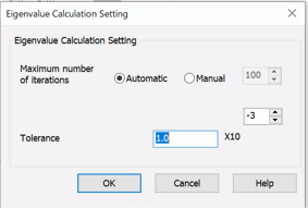 Specify the maximum number of iterations for the eigenvalue calculation and the convergence tolerance. If the [Maximum number of iterations] is automatic, the iterations are set automatically.