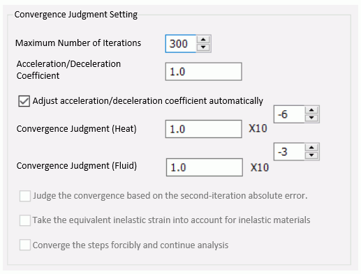 Iterative calculations are repeated until the convergence is achieved in the fluid and fluid-thermal analysis. Different values for convergence judgment can be set for fluid analysis and thermal analysis. The calculation will stop when the iterations reach the [Maximum number of iterations].