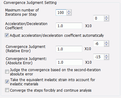 [Output intermediate result during the iteration] When selected, the intermediate result is output if the calculation did not converge. The result file size becomes larger. If deselected, the intermediate result is not output. The last nonconverged result or diverged result is only output.