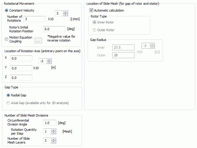 Automatic Calculation Calculates the sliding mesh location automatically. Generally this option is selected. Deselect it only when the automatic calculation does not work. Set the parameters manually as follows.