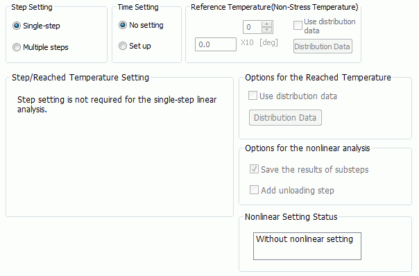 *) If [Single step] is selected for the Step Setting and the linear analysis is set, the dialog box will not appear as the setting is not required. *) Items not required for the setting will not be shown. |
