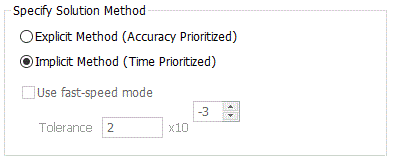 Time-directional solution method is selected for the acoustic analysis. Explicit method and implicit method are available. The explicit method is an accuracy-oriented solution, and the implicit method is a speed-oriented solution.