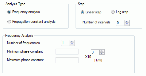 Number of frequencies is equal to the number of modes. Minimum and maximum phase constants define the range for calculating the frequencies. |