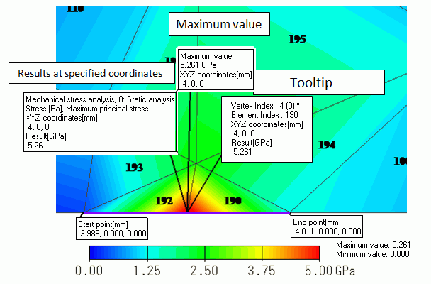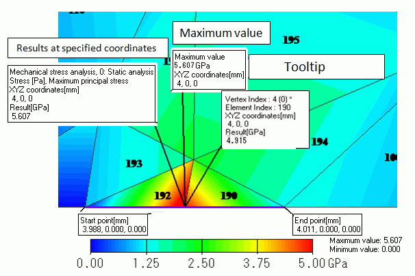 [Results at Specific Coordinates] indicates 5.607GPa which is the value for Element 192. [Tooltip] indicates 4.915GPa for Element 190.