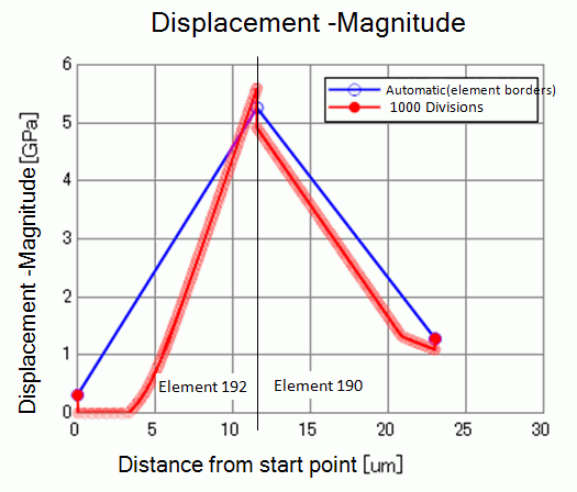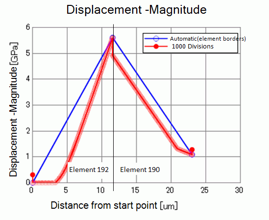 The graph below shows two plots for the maximum principle stress in the proximity of the node: one is with the number of divisions set to 1000 between startpoint and endpoint and the other is set with automatic division.