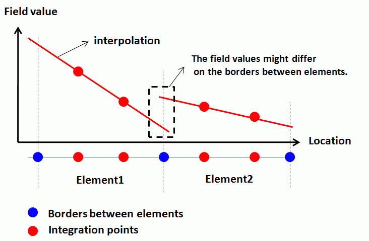 The integration points, where the governing equations are solved, are discretely located inside the elements, so the field values at the specified points are obtained by interpolating the values at integration points.