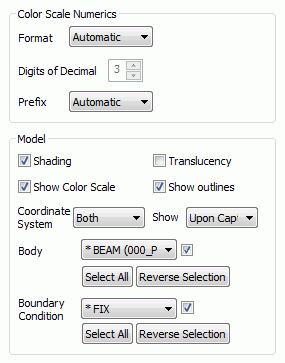 Boundary condition names on the pull-down menu are selectable one by one and their show/hide can be set individually.. Select All shows all boundary conditions. Reverse Selection reverses the show/hide of all boundary conditions. |