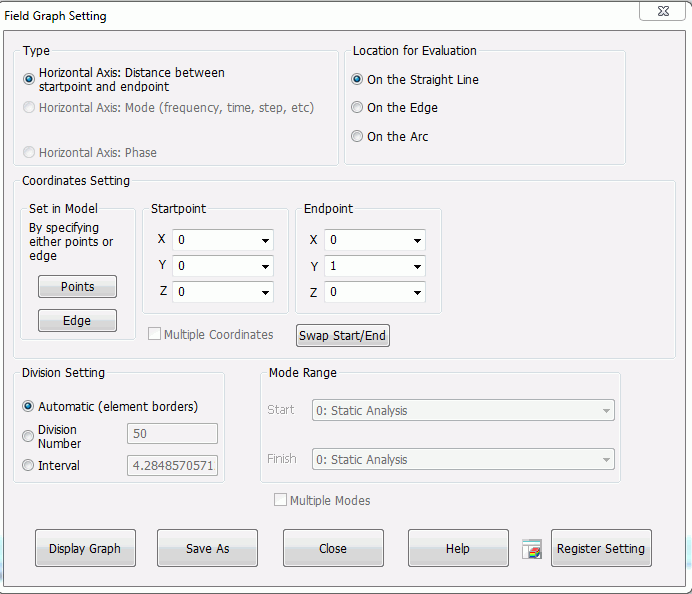 Division SettingIf [Automatic] is selected, the points bordering elements will be the plot points. "Averaging" can be switched on/off on [Contour tab]. Plot points can be specified by Number of Divisions or Interval as well. Mode RangeSets the modes for graphing.