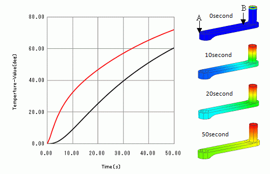 The figure below indicates the temperature change over the time: Black is for Point A and Red is for Point B.