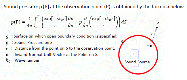 Sound wave directivity is calculated using the Kirchhoff integral theorem. The theoretical equation is as follows.