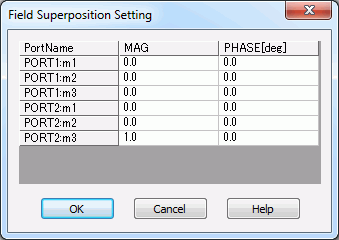 The list below shows the setting for the field superposition where the propagation mode is TE10 at PORT1, TE20 at PORT1, and TE01 at PORT2.