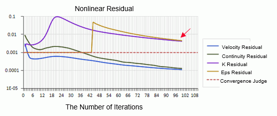 Thus, the calculation does not stop due to non-convergence. However, if the calculation proceeds with a large residual, the accuracy of the results may be low.