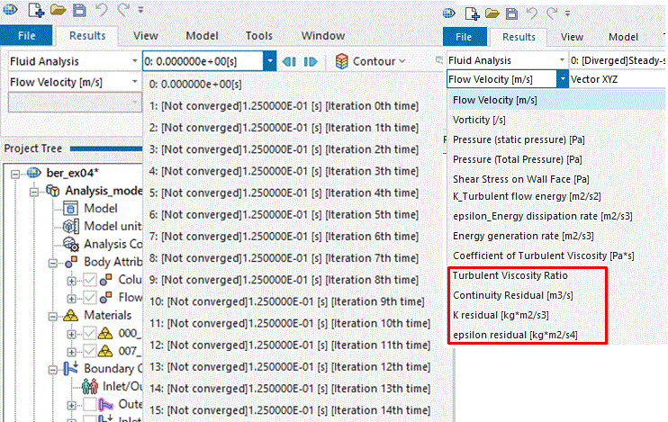 The intermediate results are not shown if the analysis is completed normally. If, however, [Output intermediate results in iteration as well] is selected in Detailed Settings of Fluid Analysis of the Fluid Analysis tab and the Fluid-Thermal Analysis tab,