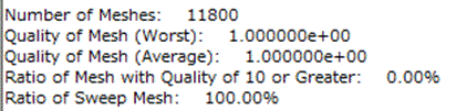 When hexahedral free mesh/sweep mesh is used, the ratio at which sweep meshes have been generated will be displayed on the output window as shown below.