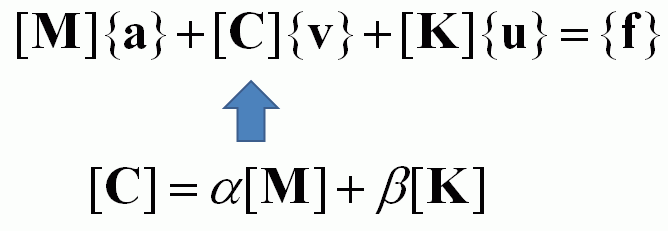 [K] is the stiffness matrix, which is related to the material's elasticity and density and coefficients of Rayleigh damping.