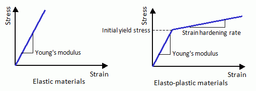 The graphs below show the stress and strain of elastic material and elasto-plastic material.
