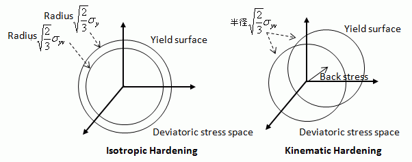 The figures below show the yield surfaces of isotropic and kinetic hardening in the deviatoric stress space.