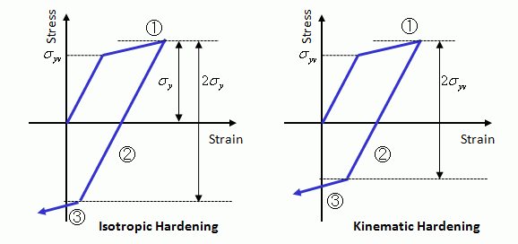 Isotropic and kinetic hardening are compared where stress is gradually loaded until the yield occurs, then the stress is loaded reversely.