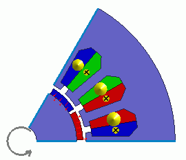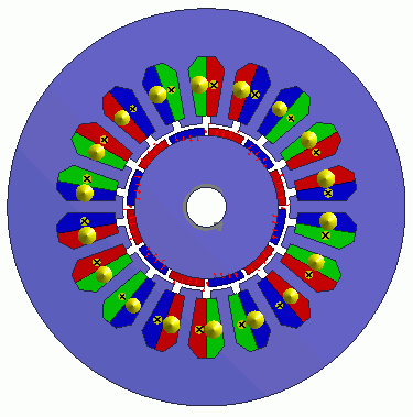 Coils are placed on the stator core. Red: U-phase coil Green: V-phase coil Blue: W-phase coil