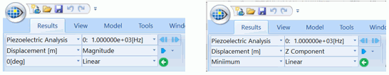 In a piezoelectric analysis, when the frequency characteristics of displacement at phase zero is plotted, the peak is divided around the resonant frequency (1 in the right figure).
