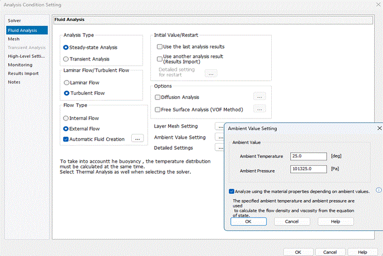 If selected, ambient temperature and ambient pressure can be set in the fluid analysis, and ambient pressure can be set in the fluid-thermal analysis.
