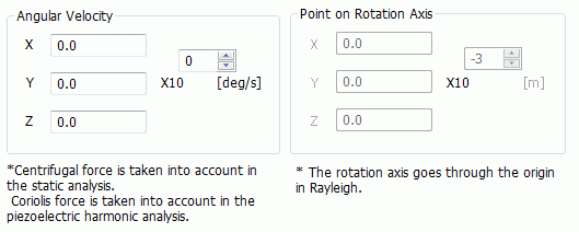 Sets the vector . The vector direction indicates the axis direction. The vector magnitude indicates the rotation speed. In static analysis, the centrifugal force is taken into account based on the input angular velocity. In the case of harmonic piezoelectric analysis, the Coriolis force is taken into account.