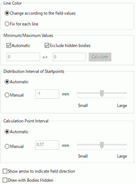 Automatic calculates the minimum and maximum values for the color scale automatically. If Automatic is deselected, the minimum value and maximum value can be set manually. Calculate button sets the minimum and maximum values calculated automatically. Exclude hidden bodies calculates the minimum and maximum values with currently displayed bodies.