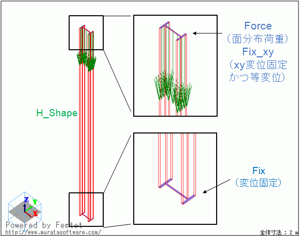 底面の変位を固定し、上面に下向きの荷重およびXY方向の変位固定(+等変位※)を設定しています。