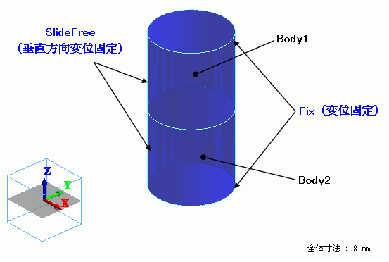 円柱形状のソリッドボディを上下均等に分割し、上下面には完全変位固定、円柱側面には垂直方向変位固定