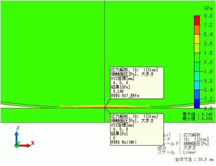解析結果より接触面における最大接触面圧力は8.246[GPa]であることが分かります。