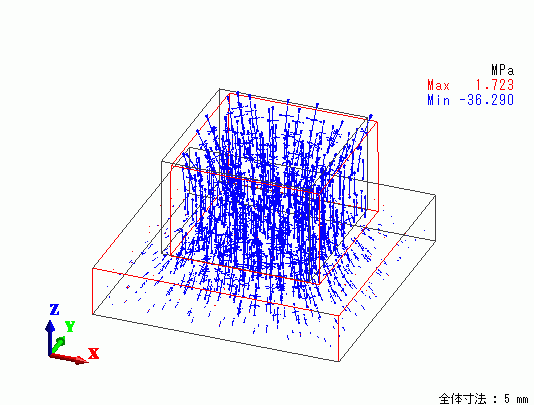 モデル内部の最小主応力の方向が摩擦力の方向に傾いていることが分かります。