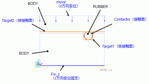 下側のBODYの底面にはz方向固定、上側のBODYの上面には、z方向変位を与えます。