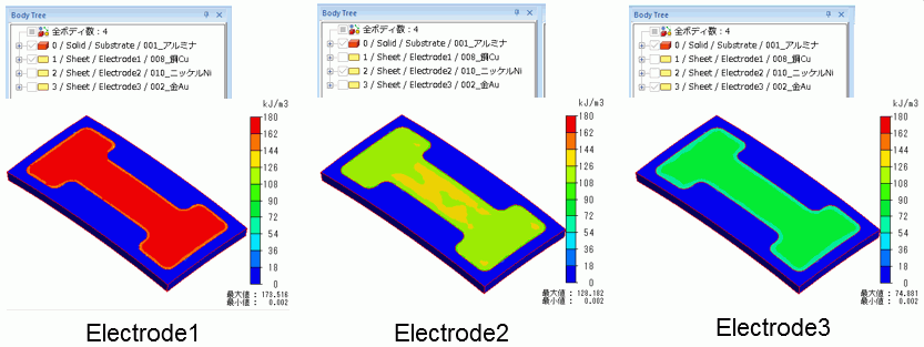 3つの電極シートの中ではElectrode1(Cu)に最もひずみエネルギーが蓄積されていることがわかります。